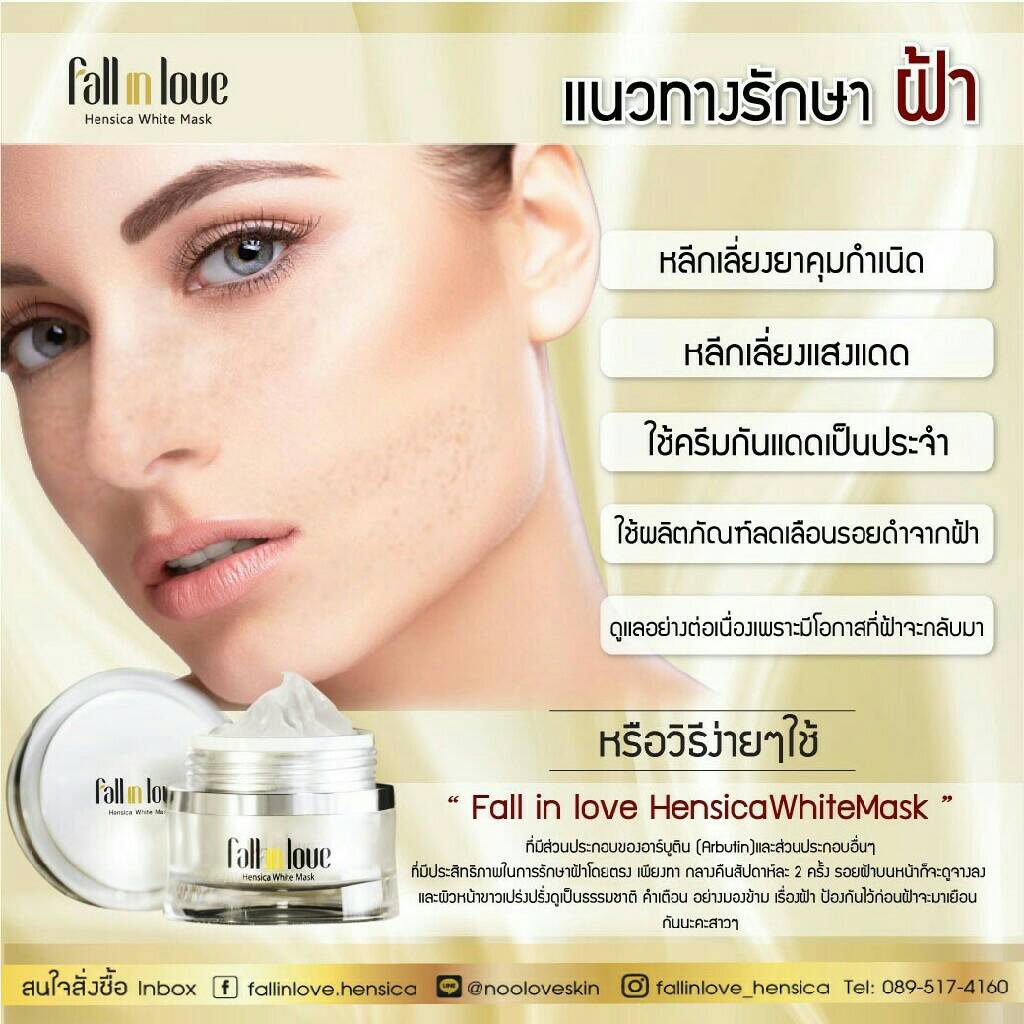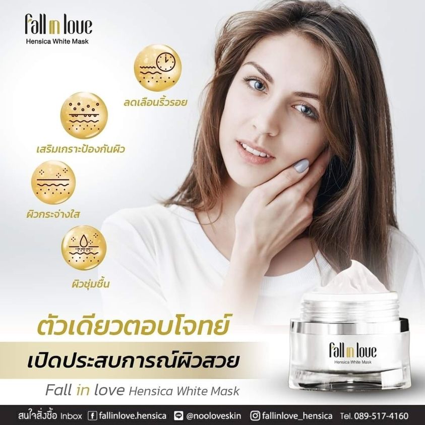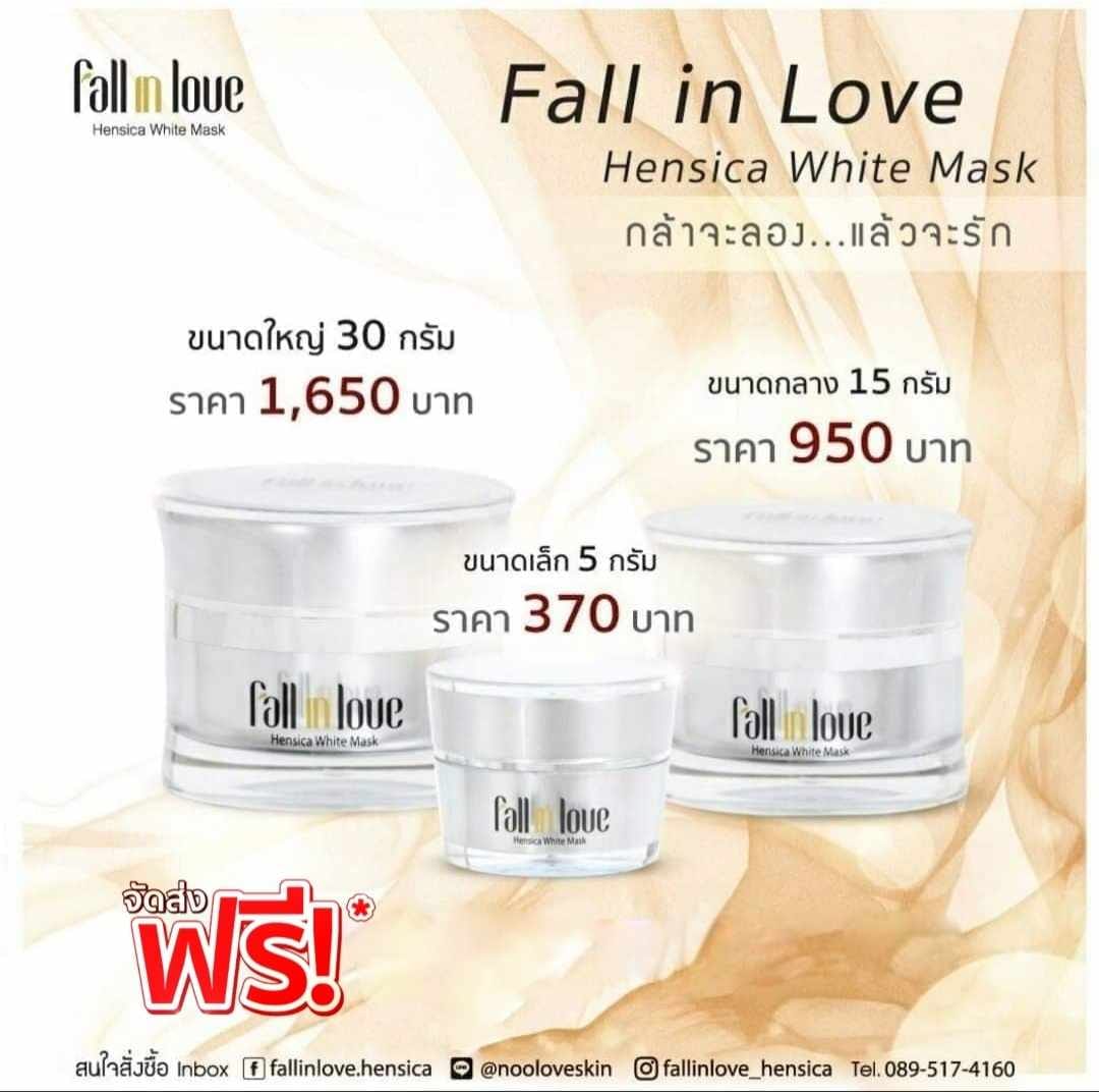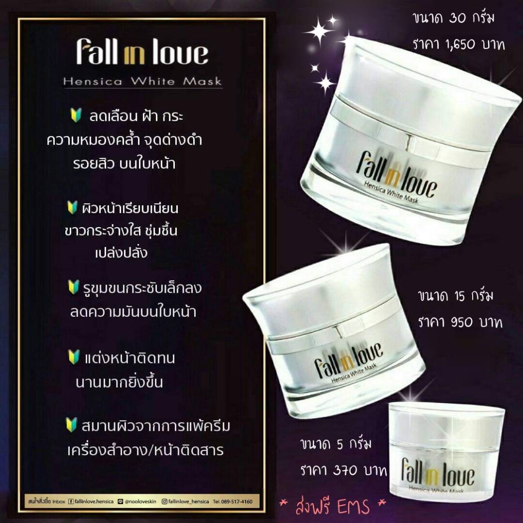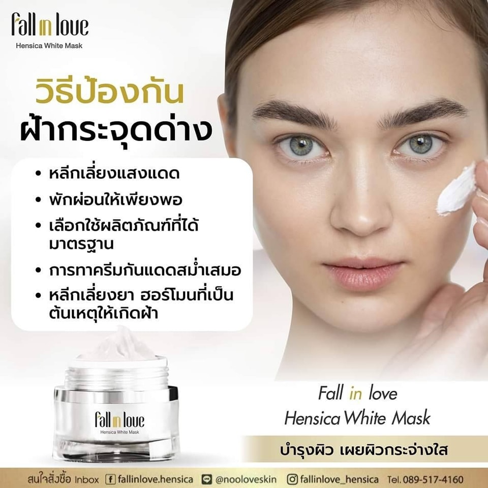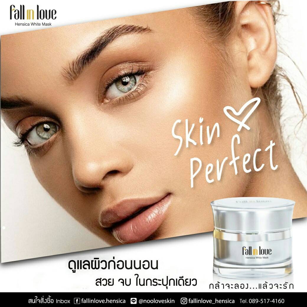 นวัตกรรมใหม่ Fall in Love Hensica White Mask ที่ขอท้าพิสูจน์ในเวลาเพียงค่ำคืนเดียวที่จะช่วยให้ใบหน้าของคุณเนียนนุ่ม สดใส น่าสัมผัส ซึ่งเป็นผลิตภัณฑ์มาส์กเข้มข้นบำรุงผิวหน้าขณะหลับ ที่จะช่วยให้คุณสาวๆที่มีใบหน้าหมองคล้ำ ฝ้า กระจุดด่างดำให้แลดูจางลง ขาวใสอย่างเป็นธรรมชาติ