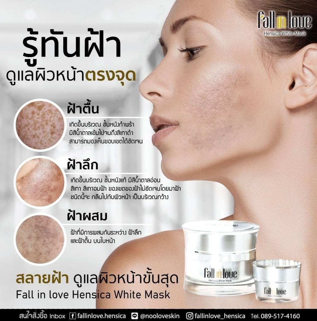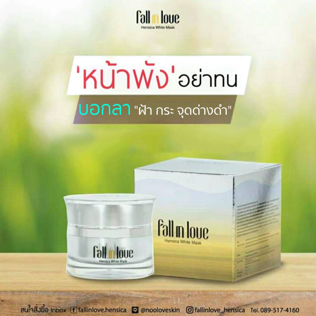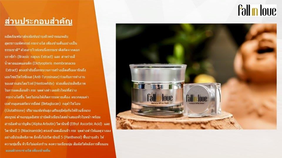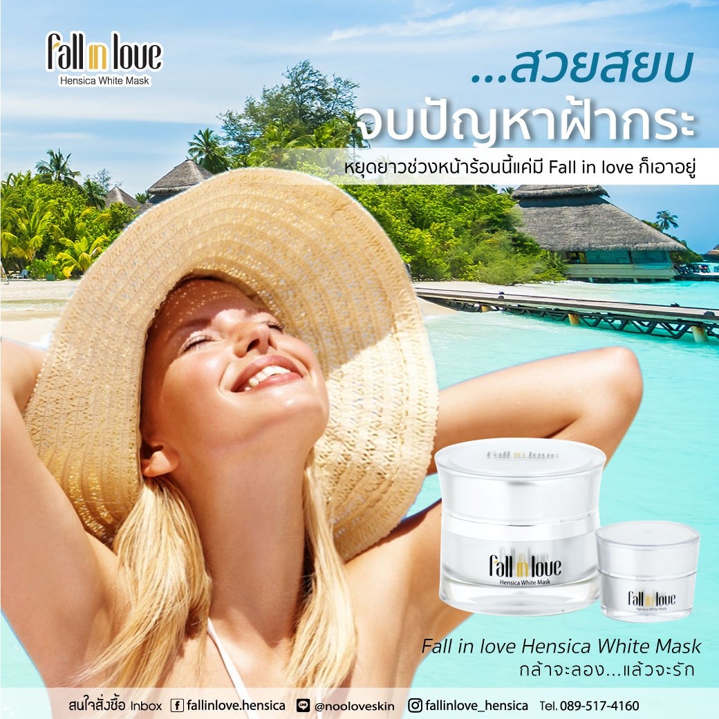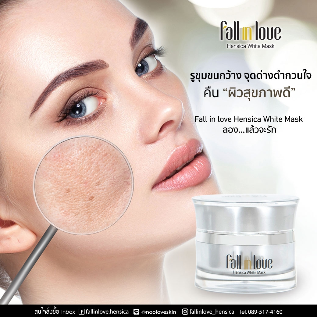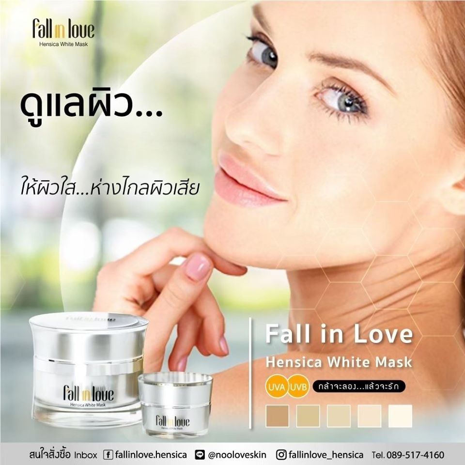 นวัตกรรมใหม่ Fall in Love Hensica White Mask ที่ขอท้าพิสูจน์ในเวลาเพียงค่ำคืนเดียวที่จะช่วยให้ใบหน้าของคุณเนียนนุ่ม สดใส น่าสัมผัส ซึ่งเป็นผลิตภัณฑ์มาส์กเข้มข้นบำรุงผิวหน้าขณะหลับ ที่จะช่วยให้คุณสาวๆที่มีใบหน้าหมองคล้ำ ฝ้า กระจุดด่างดำให้แลดูจางลง ขาวใสอย่างเป็นธรรมชาติ