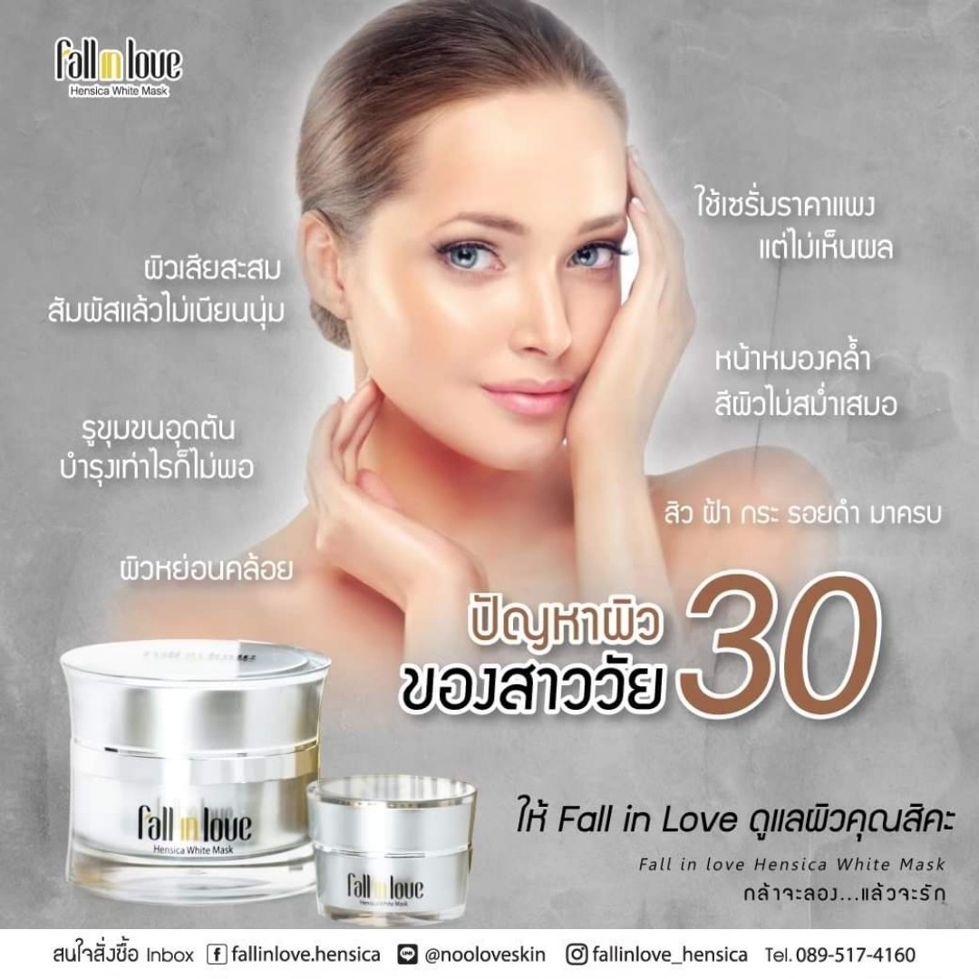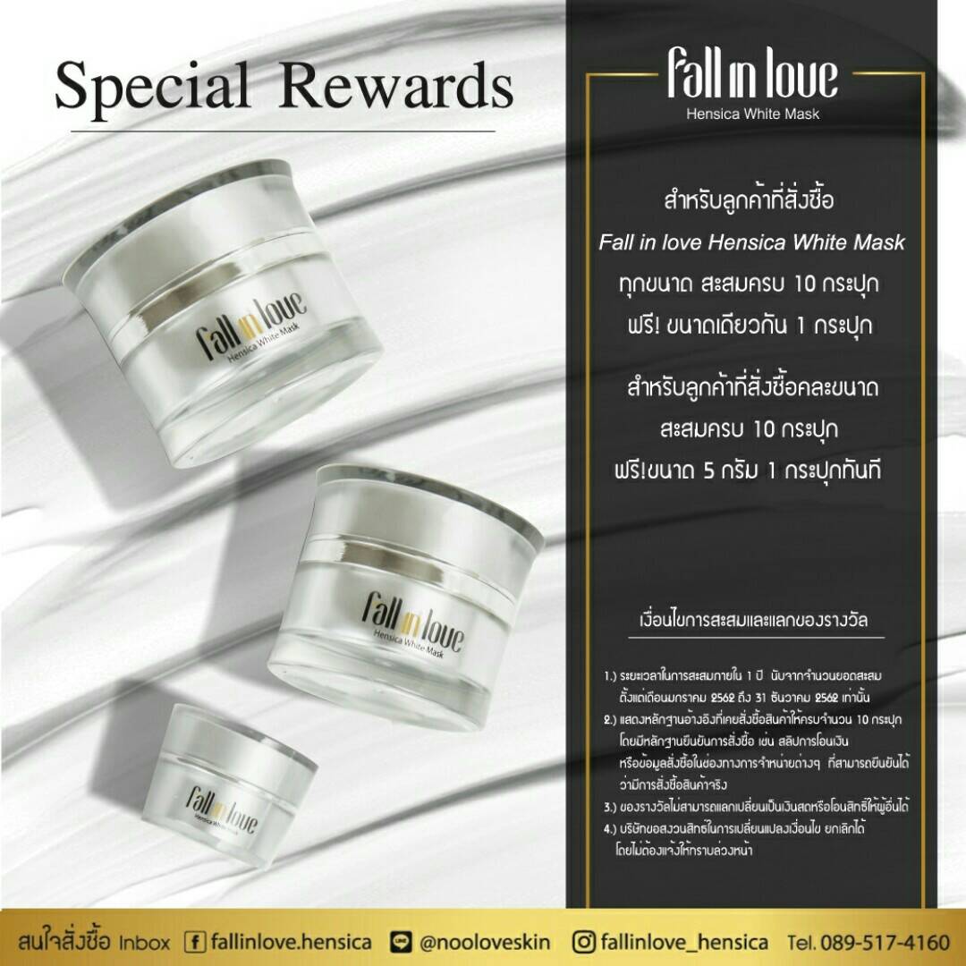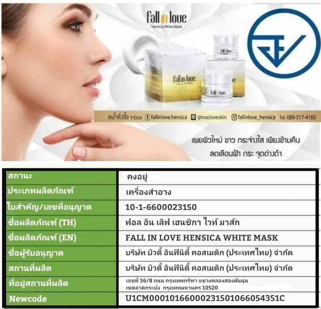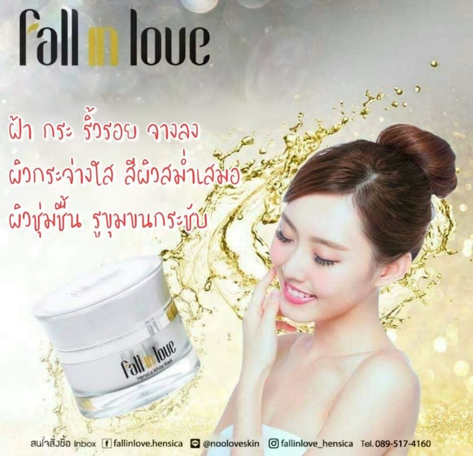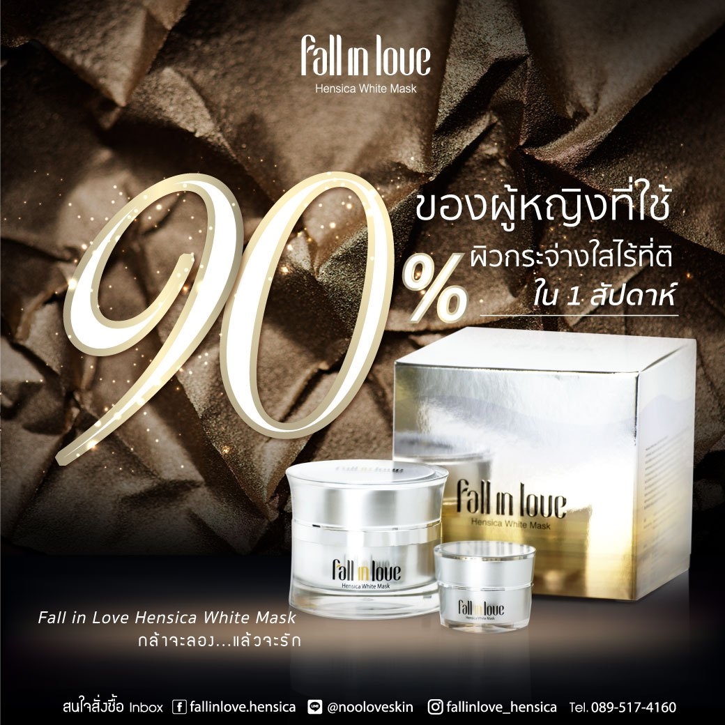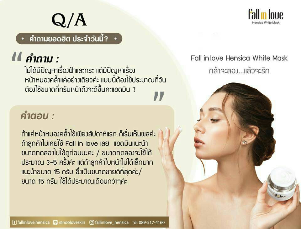 นวัตกรรมใหม่ Fall in Love Hensica White Mask ที่ขอท้าพิสูจน์ในเวลาเพียงค่ำคืนเดียวที่จะช่วยให้ใบหน้าของคุณเนียนนุ่ม สดใส น่าสัมผัส ซึ่งเป็นผลิตภัณฑ์มาส์กเข้มข้นบำรุงผิวหน้าขณะหลับ ที่จะช่วยให้คุณสาวๆที่มีใบหน้าหมองคล้ำ ฝ้า กระจุดด่างดำให้แลดูจางลง ขาวใสอย่างเป็นธรรมชาติ