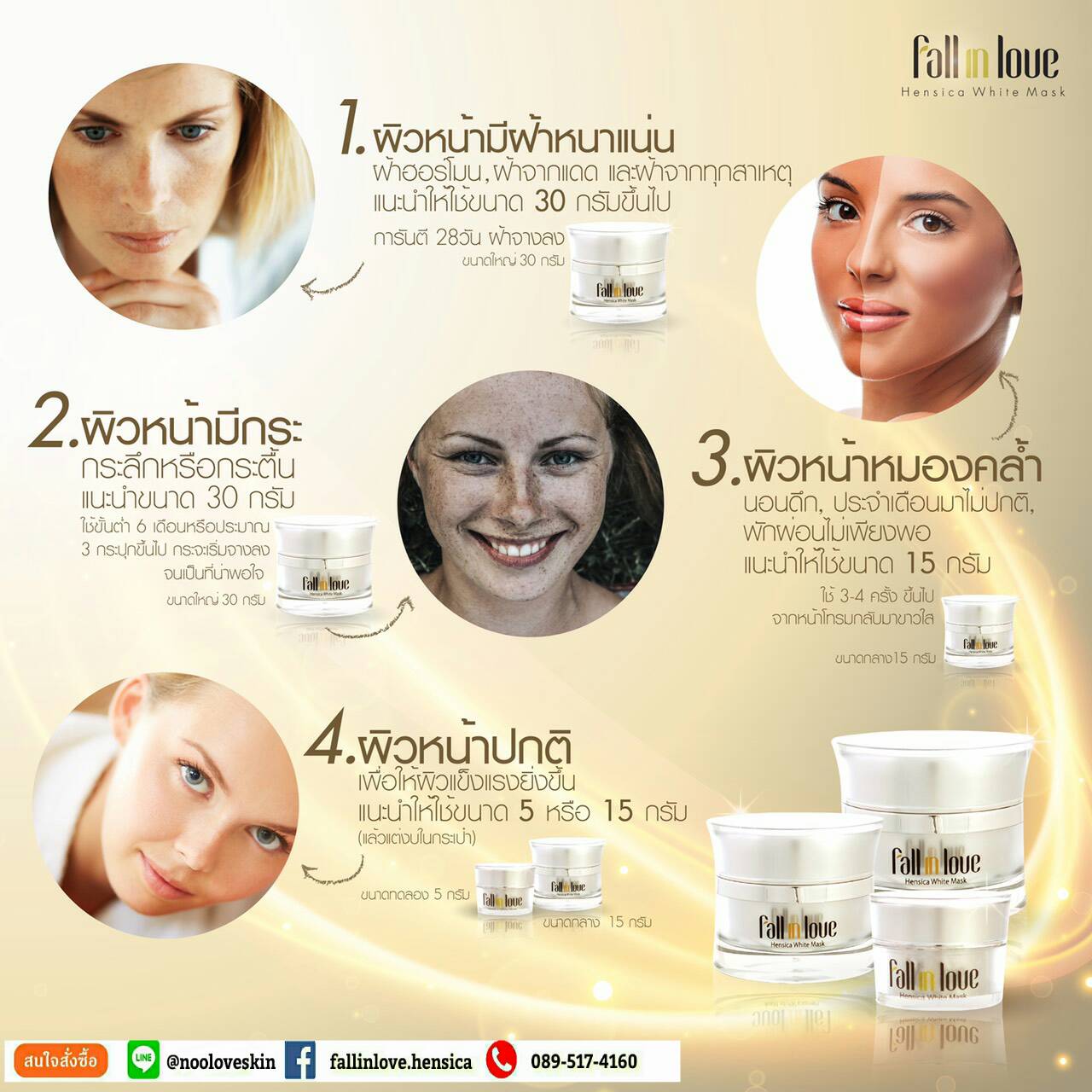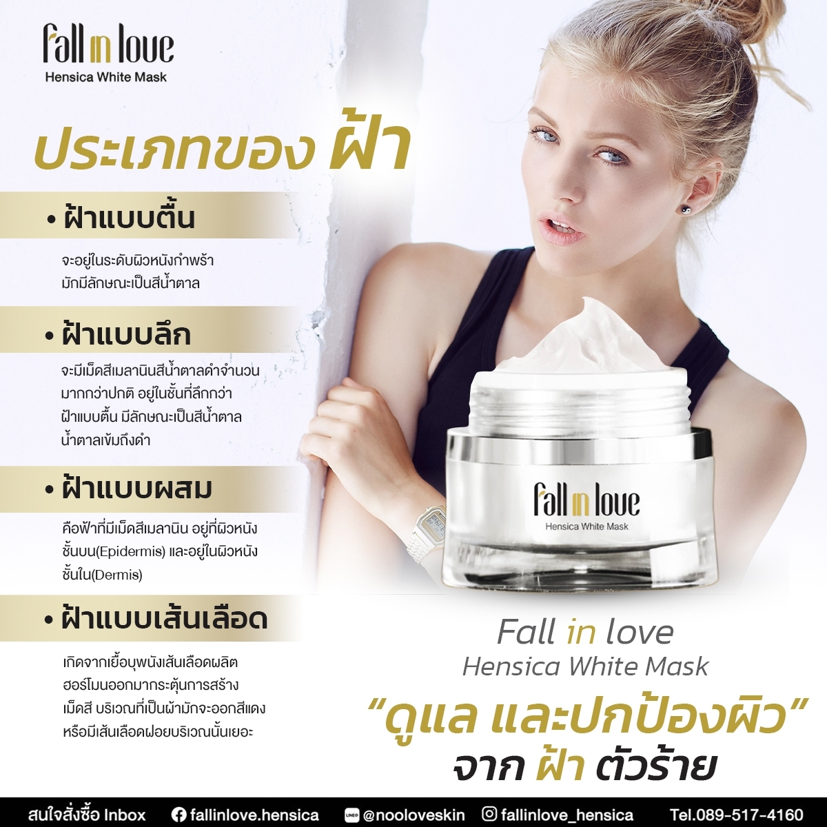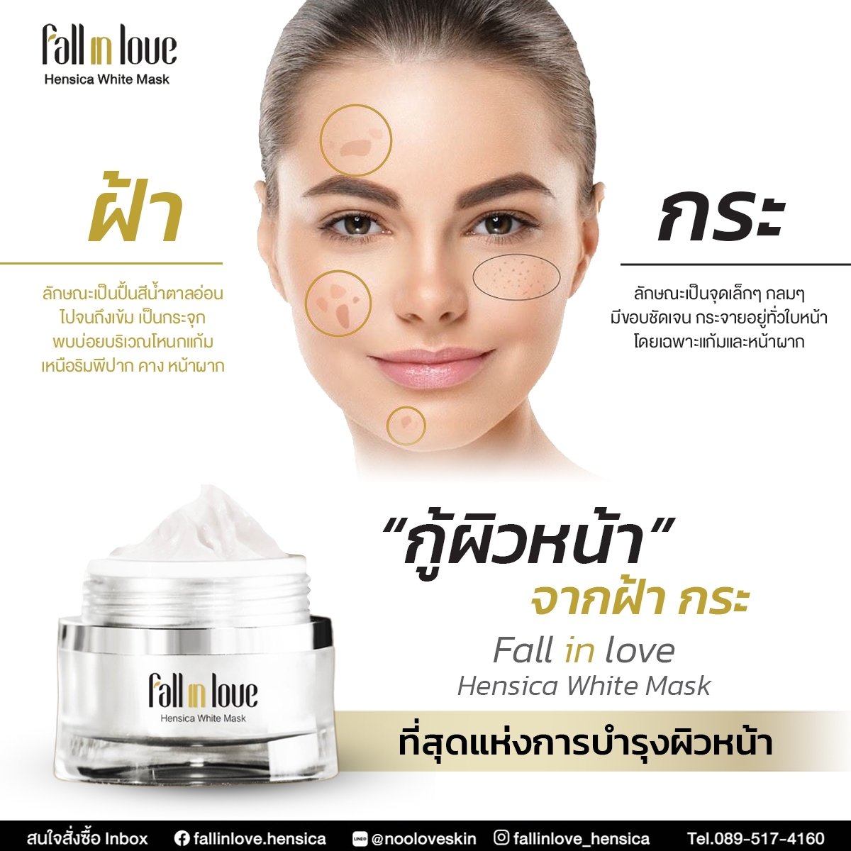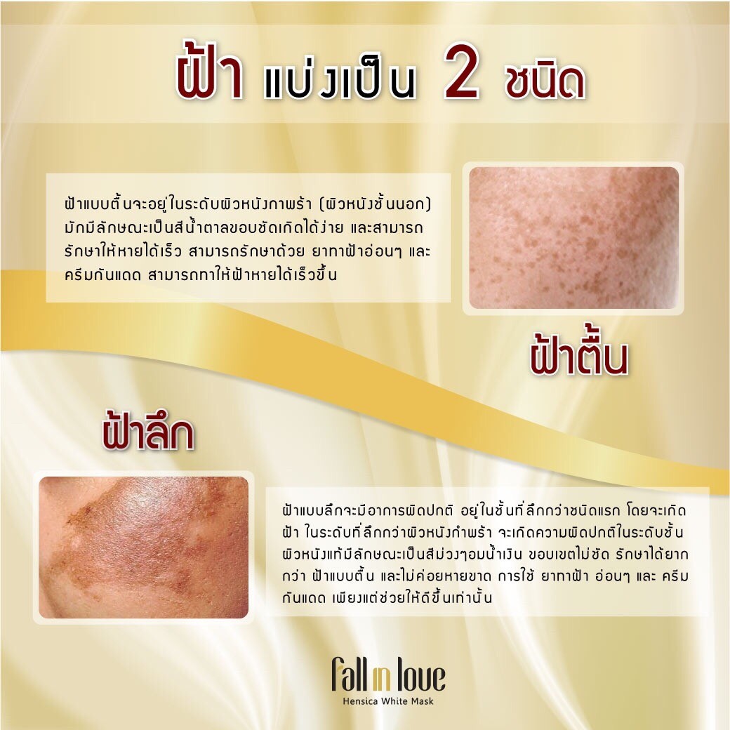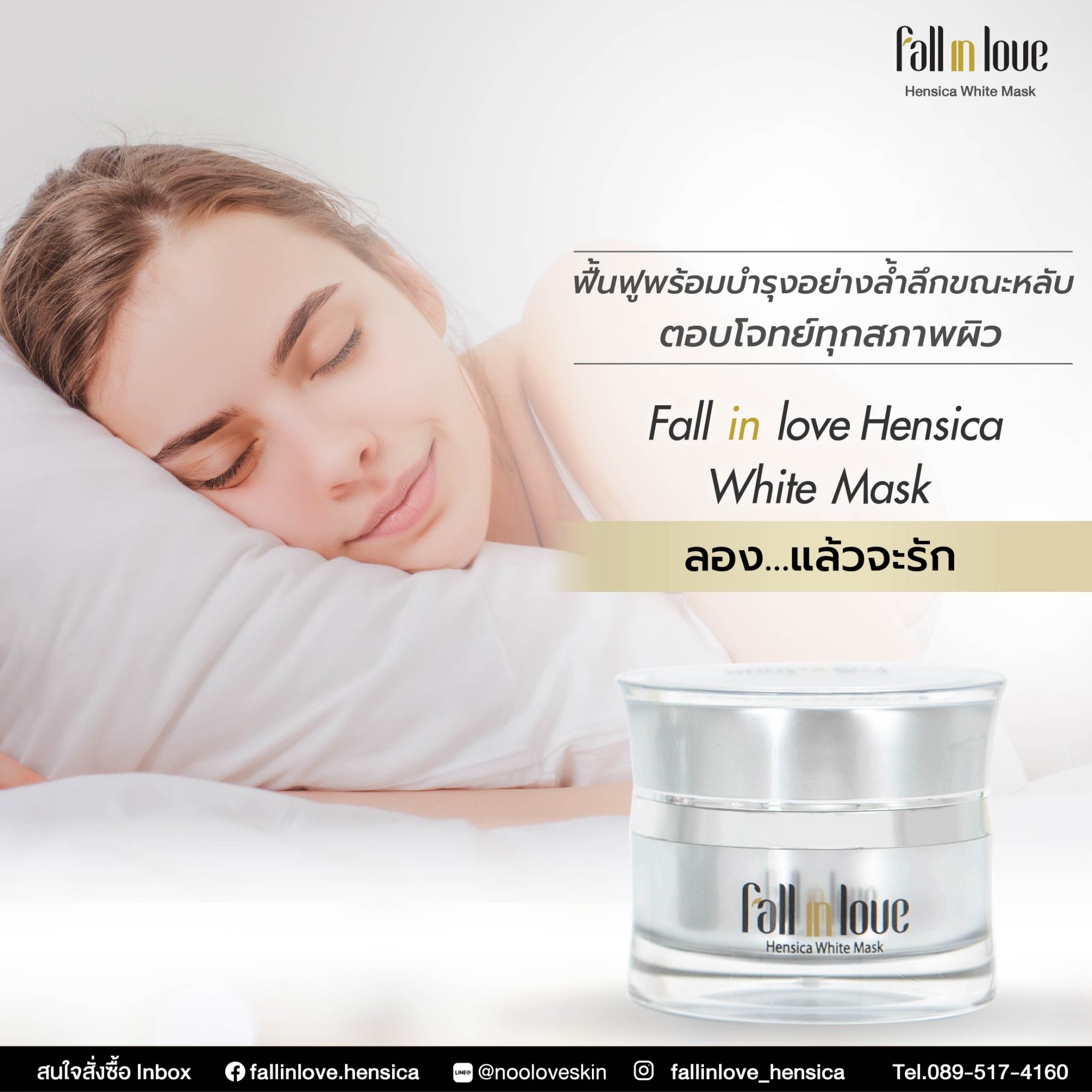 นวัตกรรมใหม่ Fall in Love Hensica White Mask ที่ขอท้าพิสูจน์ในเวลาเพียงค่ำคืนเดียวที่จะช่วยให้ใบหน้าของคุณเนียนนุ่ม สดใส น่าสัมผัส ซึ่งเป็นผลิตภัณฑ์มาส์กเข้มข้นบำรุงผิวหน้าขณะหลับ ที่จะช่วยให้คุณสาวๆที่มีใบหน้าหมองคล้ำ ฝ้า กระจุดด่างดำให้แลดูจางลง ขาวใสอย่างเป็นธรรมชาติ